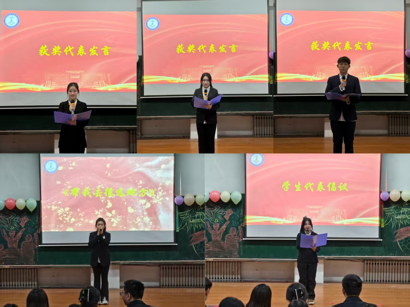 受表彰的先进个人、优秀学生会工作人员及先进集体代表依次发言,分别分享潜心治学、践行奉献、凝聚集体的感悟与经验,真挚恳切的分享为全体同学树立了可学可追的榜样标杆。歌曲《带我去很远地方》悠扬唱响,传递出青年学子逐梦远方、报效祖国的坚定信念。学生代表发起倡议,号召全体同学铭记“一二·九”运动精神内核,以史为鉴、励志成才,将个人理想融入民族复兴伟业,用实干书写青春担当。